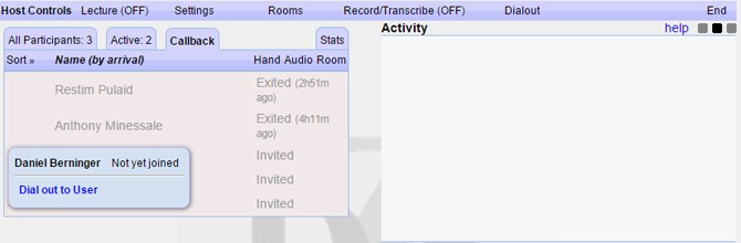 A host can click on any of the listed names to access a pop-up menu of options for that person. If the system has contact details for that participant the pop-up menu includes the option to Dial out to User.